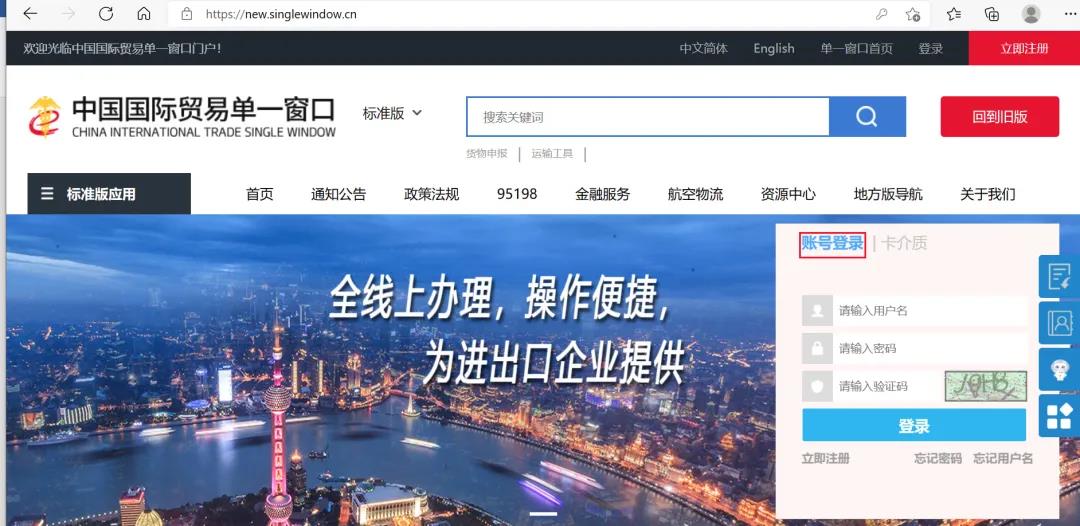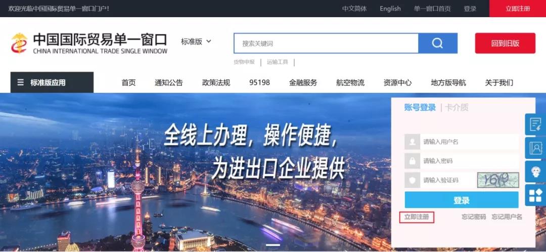 1、登錄“中國國際貿(mào)易單一窗口”標(biāo)準(zhǔn)版(網(wǎng)址:https://www.singlewindow.cn/),選擇“新版單一窗口門戶入口”,在新界面中選擇“立即注冊”。