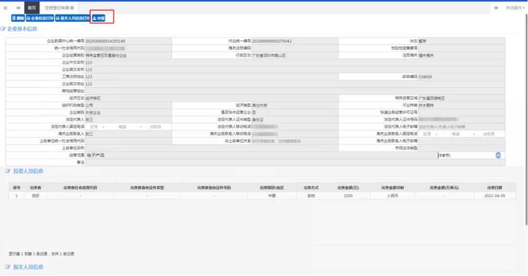 9、當(dāng)以上信息均填寫完畢,便可向海關(guān)進行申報操作: