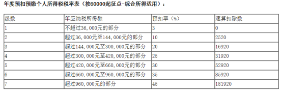 適用工資、薪金的個人所得稅采用七級超額累進稅率,也就是根據(jù)個人的薪資劃分為七個等級,不同等級的稅率不同,最低一級為3%,最高一級為45%,具體如下: