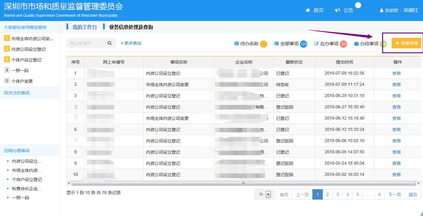 登錄之后界面如下。在頁(yè)面的右上角找到“我要申請(qǐng)”背景為黃色的選項(xiàng):
