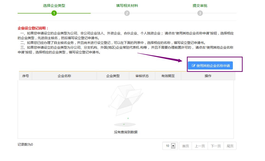 點(diǎn)擊“辦理”之后,跳轉(zhuǎn)到下面的界面,可以先閱讀一下企業(yè)設(shè)立登記說(shuō)明;然后點(diǎn)擊頁(yè)面右上角“使用其他企業(yè)名稱申請(qǐng)”,如下圖:
