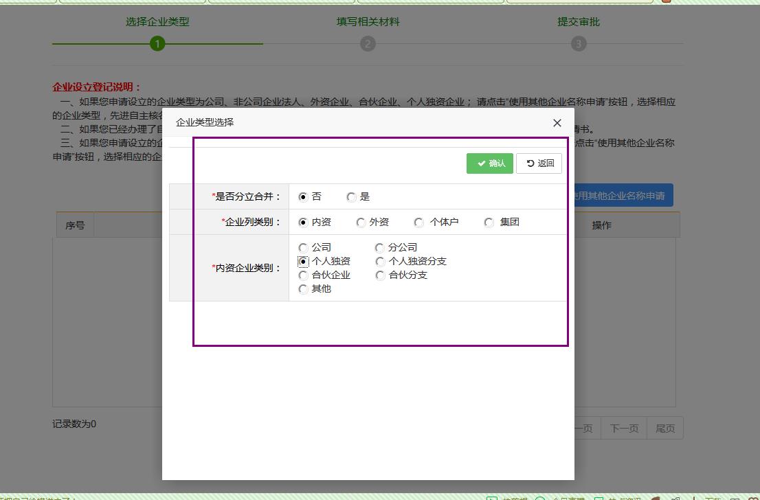 選擇之后會(huì)彈出一個(gè)“企業(yè)類型選擇”的彈窗;選擇好自己企業(yè)的類別,然后點(diǎn)擊確認(rèn):如下圖: