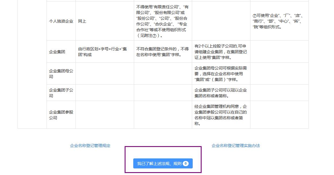 點(diǎn)擊確認(rèn)之后,跳轉(zhuǎn)企業(yè)名稱自主申報(bào)規(guī)則頁(yè)面;一般都是一些關(guān)于公司名稱,公司成員,公司形式的要求,可以閱讀一下,也可以直接點(diǎn)擊最下面“我已了解上述法規(guī),規(guī)則”(注意:系統(tǒng)會(huì)有一個(gè)21秒的閱讀時(shí)間,在這個(gè)時(shí)間內(nèi)是無(wú)法點(diǎn)擊五一了解上述法則,法規(guī),等待21秒過(guò)完即可)如下圖: