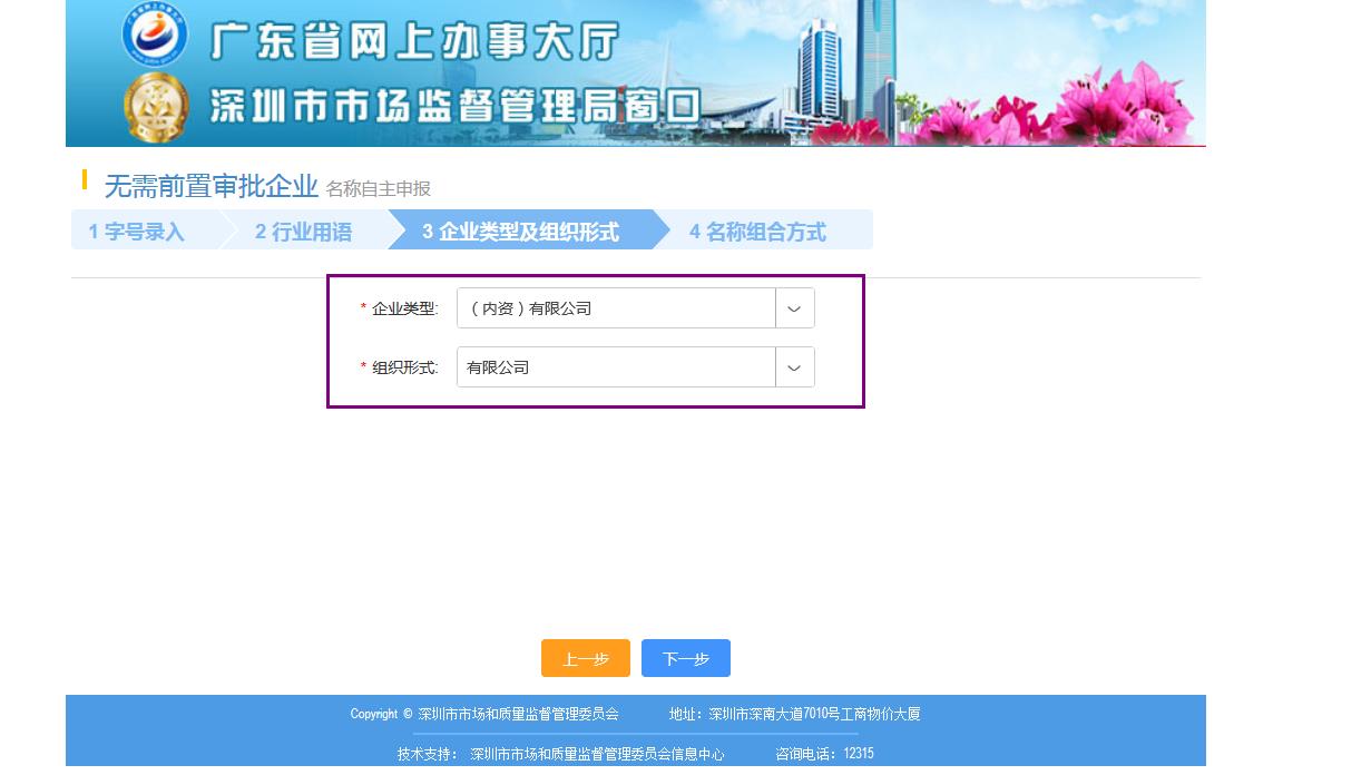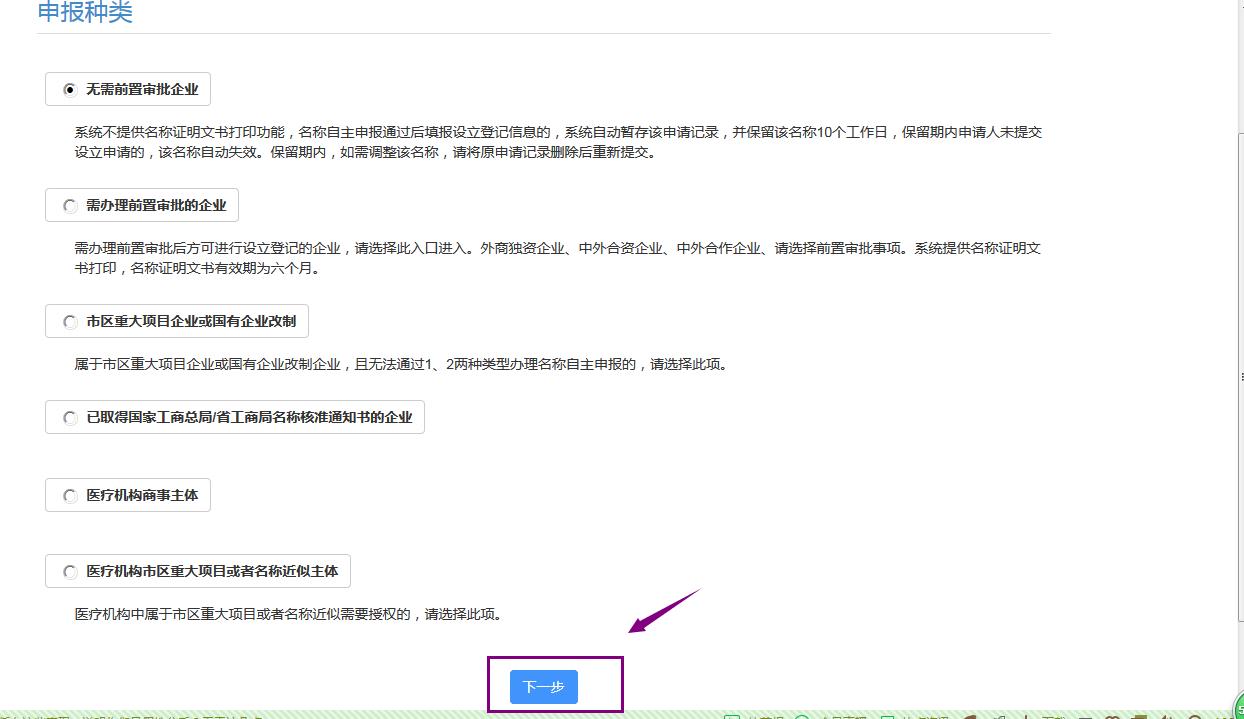 這里是核名第三步,選擇企業(yè)類型和企業(yè)組成形式,如下圖: