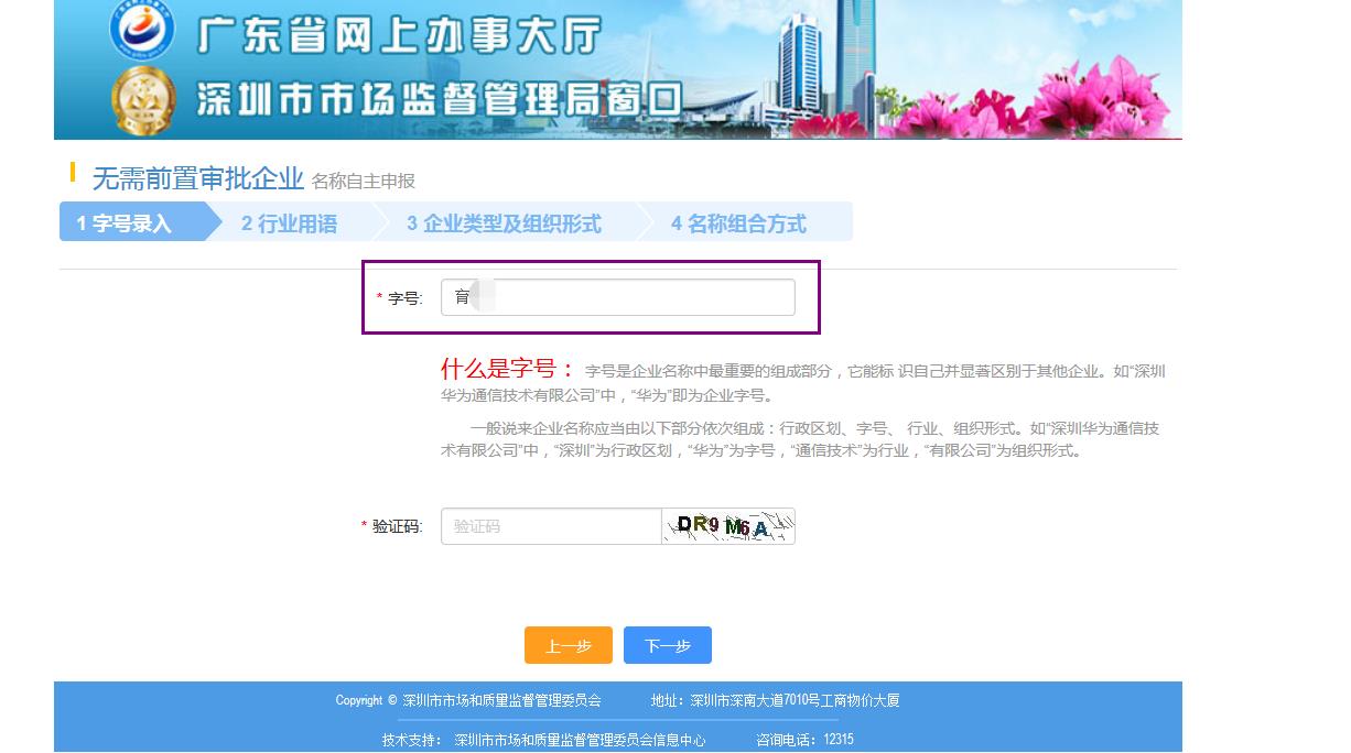 接下來(lái)是非常重要的一步,“公司核名”,將你準(zhǔn)備好的公司名稱輸入你的字號(hào)就可以。無(wú)需輸入公司全稱。(注意,公司名稱的組成形式為:“深圳市”+“字號(hào)”+“行業(yè)”+“有限公司”)在輸入框只需要輸入你的公司字號(hào)就可以。然后輸入驗(yàn)證碼,點(diǎn)擊下一步,如下圖