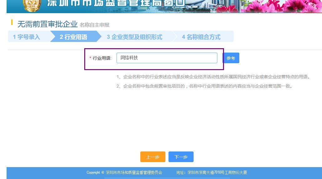下面一步就是核名第二步,輸入行業(yè)進(jìn)行查詢,點(diǎn)擊下一步,如下圖:
