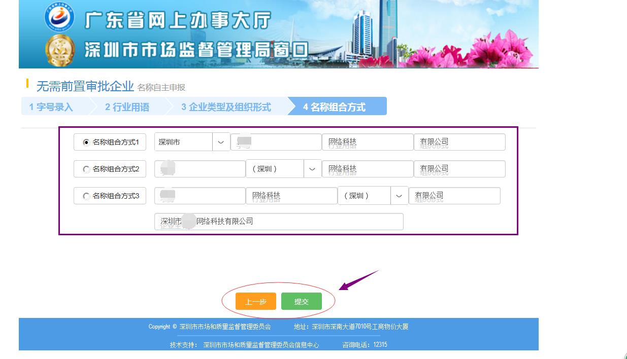下一步該恭喜你一下,你的公司名稱是可以用的,你要選擇一下你比較滿意的名稱組合方式,系統(tǒng)會(huì)給你列出所有的公司名稱組合方式供你選擇,選擇好之后,點(diǎn)擊提交,如下圖: