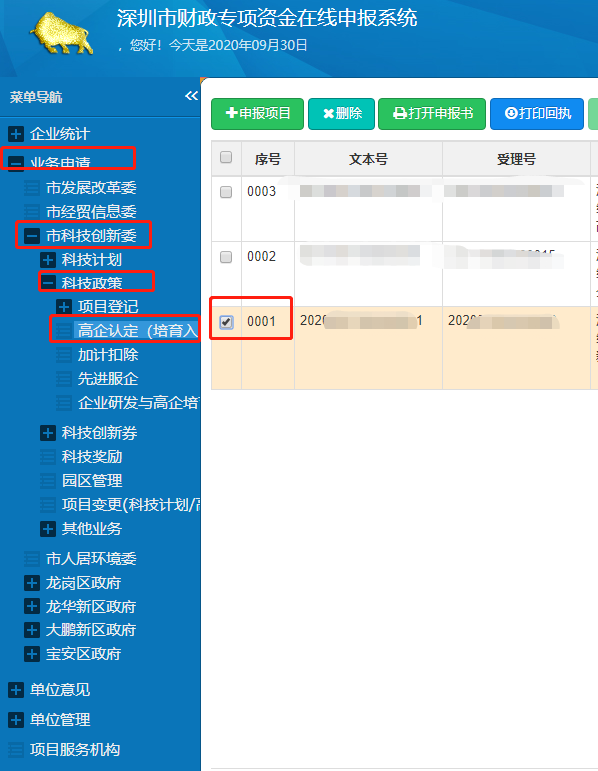 2、登陸后,依次選擇“業(yè)務(wù)申請”、“市科技創(chuàng)新委”、“科技政策”、“高企認(rèn)定(培育入庫)”選項。